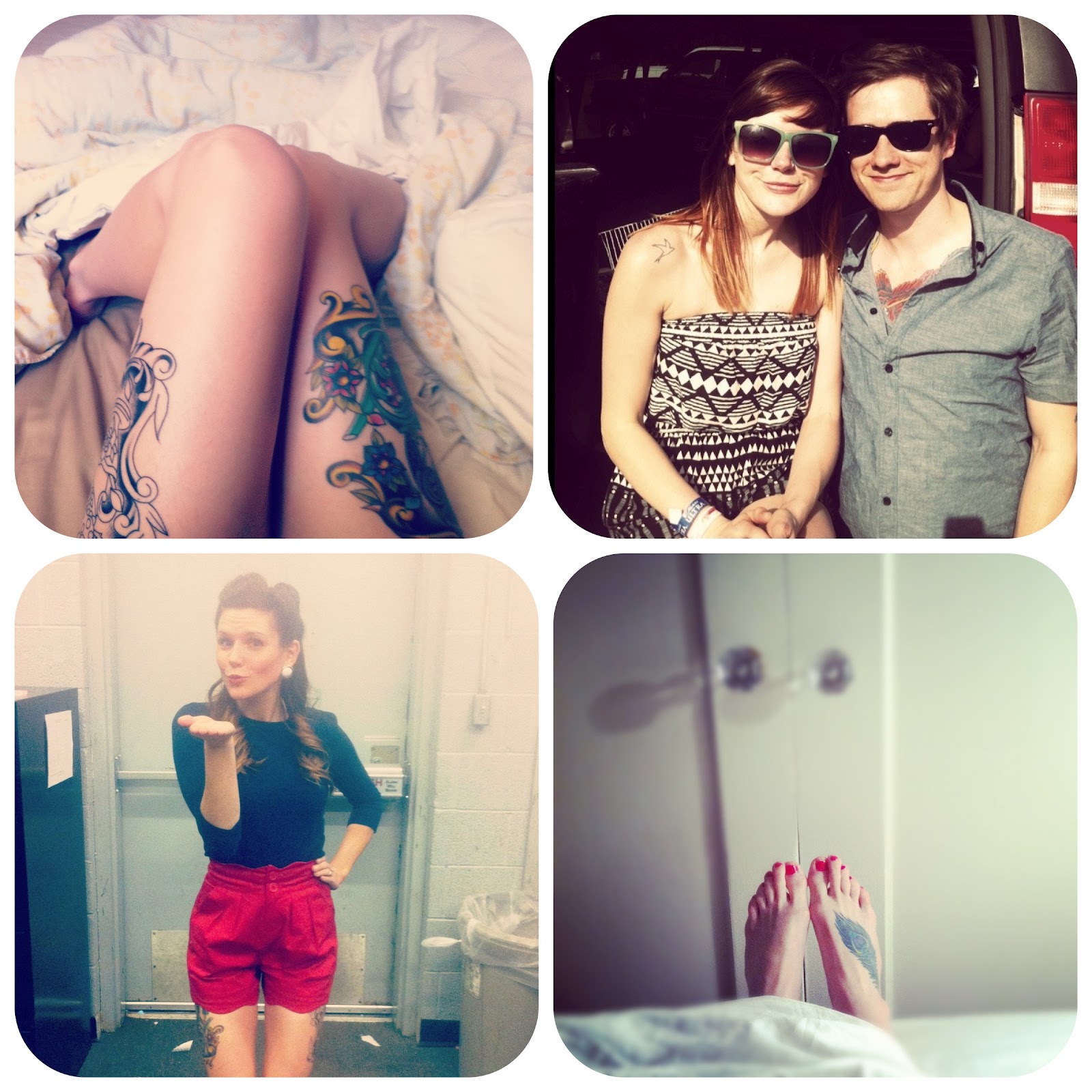 I do! Does anyone ever just get one? All of my tattoos were done at Evermore Gallery done by either Donna Klein or Carrie Davini who is also another lovely lady friend. On my left thigh I have stacked tea cups to go along with my tea pot on my right thigh. I have a cherry blossom tree on my back, which is still my favorite because it makes me think of my mom who passed away when I was 2. In Japanese culture cherry blossoms are associated with "mono no aware" for their extreme beauty and quick death. I have an outline of a small dove on the right shoulder, a peacock feather on my right foot (which is actually a cover up from that time I was 16 & thought I'd truly love blue stars forever). I have the word "love" on my left wrist, a few hearts on the inside of my lip as well as "Mrs." on my wedding ring finger.